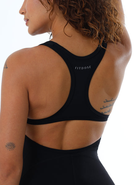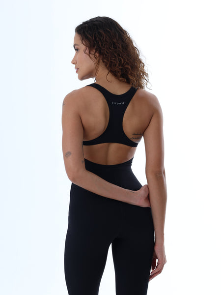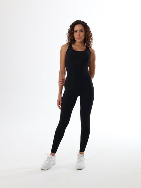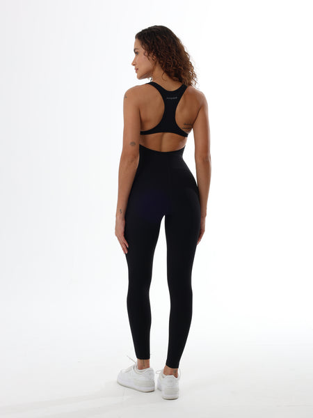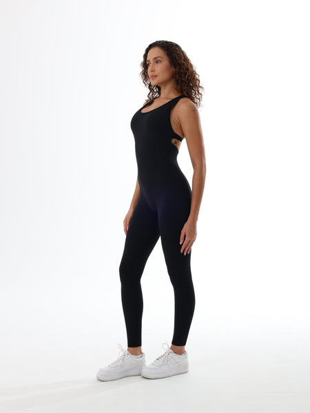 Elevate your activewear collection with this sophisticated open-back jumpsuit in classic black. Designed for those who demand both style and performance, the strategic open-back design offers breathability and a modern aesthetic perfect for workouts or...